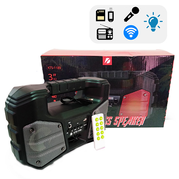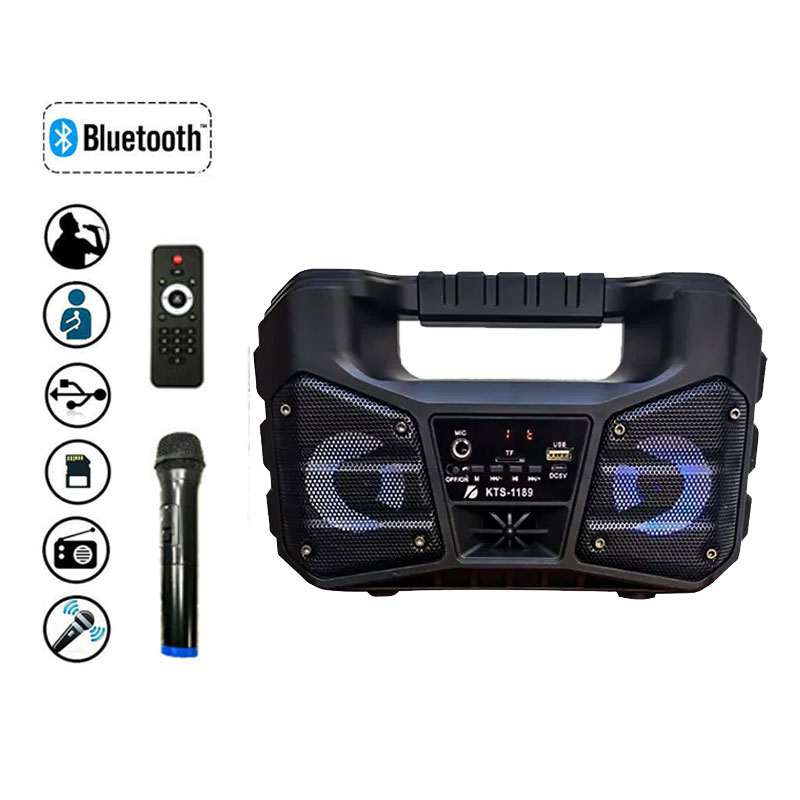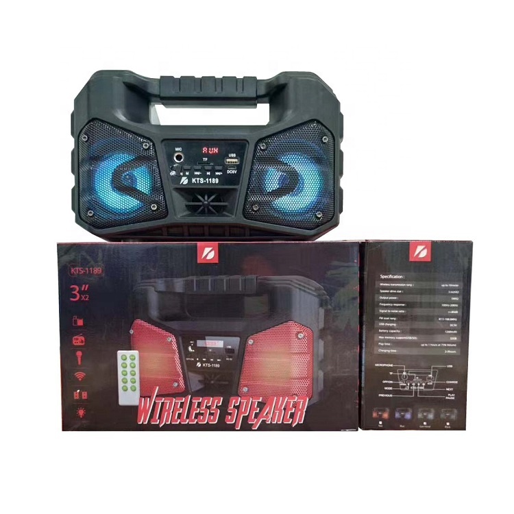 KTS-1189 Karaoke Bluetooth Speaker with REMOTESpecificationWireless transmission rang: up to 10 metersSpeaker drive size: 3inch x 2Output power: 5WX2Frequency response: 100Hz-20KHzSignal to noise ratio: >=80dBFM scan rang: 87.5-108.0MHzUSB charging: DC5VBattery Capacity: 1200mAhMax memory support(USB/SD): 32GBPlay time: up to 1 hour at 75% VolumeCharging time: 2-3hours