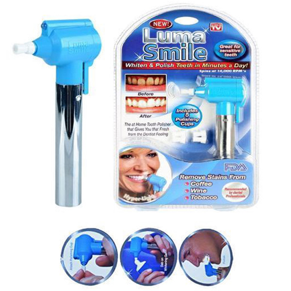 Description:- Luma Smile the at home tooth polisher that removes stains for long lasting results. The secret is the rotating rubber cup that gentle remover stains and polishes teeth. It''s easy simply attach the rubber polishing cup to the tip of the Luma Smile polisher, press to activate the powerful but gentle battery operated cordless polisher and glide across teeth to polish away stubborn surface stains. Use weekly to help maintain a beautiful white smile. Leaves teeth feeling smooth and glossy. Feature:- Tooth polisher provides professional results at home Removes stains brushing does not Leaves teeth feeling smooth and glossy Use weekly to help maintain a beautiful white smile Five polishing cups included Each polishing cup lasts up to 100 uses Requires two AA batteries(Not included) Cordless Specifications 100% Brand new Teeth Whitening Burnisher Polisher Weight:100g Color:Blue Battery:not include Unused Product